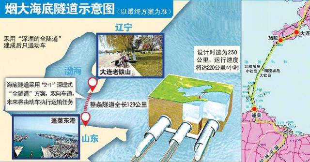 烟大海底隧道即烟台至大连海底隧道,2015年11月份国务院正式审议2016年重点工程,其中烟台到大连海底隧道施工方案正式出炉,整条隧道全长123公里,建成后将是世界上最长的海底隧道。隧道开通后,从烟台到大连最多只需要40分钟。